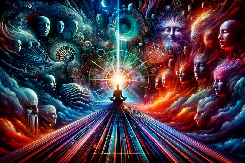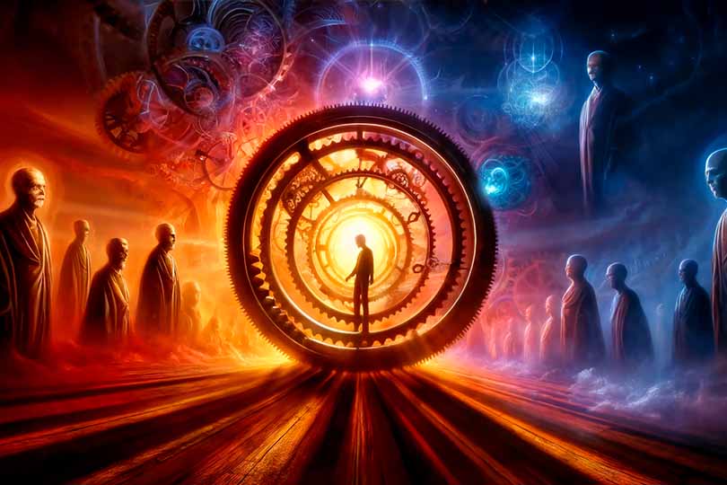 El ciclo de Samsara, con sus acciones impulsivas y consecuencias emocionales, se perpetúa a través de esta dualidad. Samsara describe el ciclo interminable de nacimiento, muerte y renacimiento, reflejando nuestra lucha constante por reconciliar las expectativas externas con nuestras verdades internas. El sincrodestino, por su parte, sugiere que nuestras desviaciones y decisiones forman parte de un camino predestinado, llevando a puntos de aprendizaje y evolución personal.